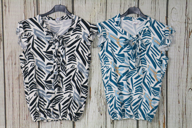 Csinos fodros ujjú mintás felső,elöl megkötős ,gumisderekú lenge felső S/M, L/XL és 2XL/3XL